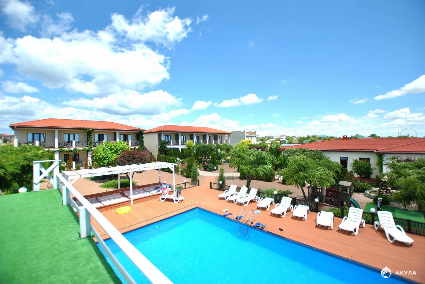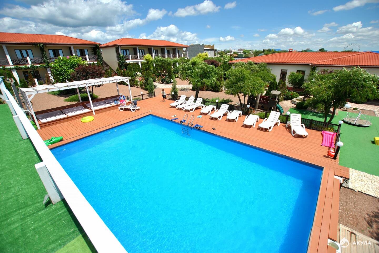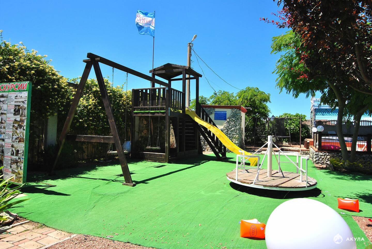 Большая благоустроенная территория имеет много зелени и цветов на которой расположены летняя площадка 120 м , просторный бассейн 80 м с морской водой, а также украшает небольшой декоративный пруд и фонтан.