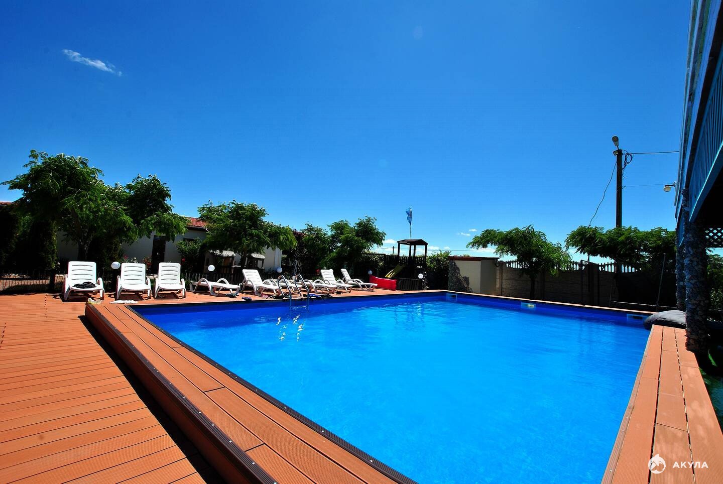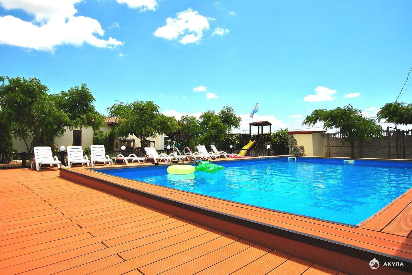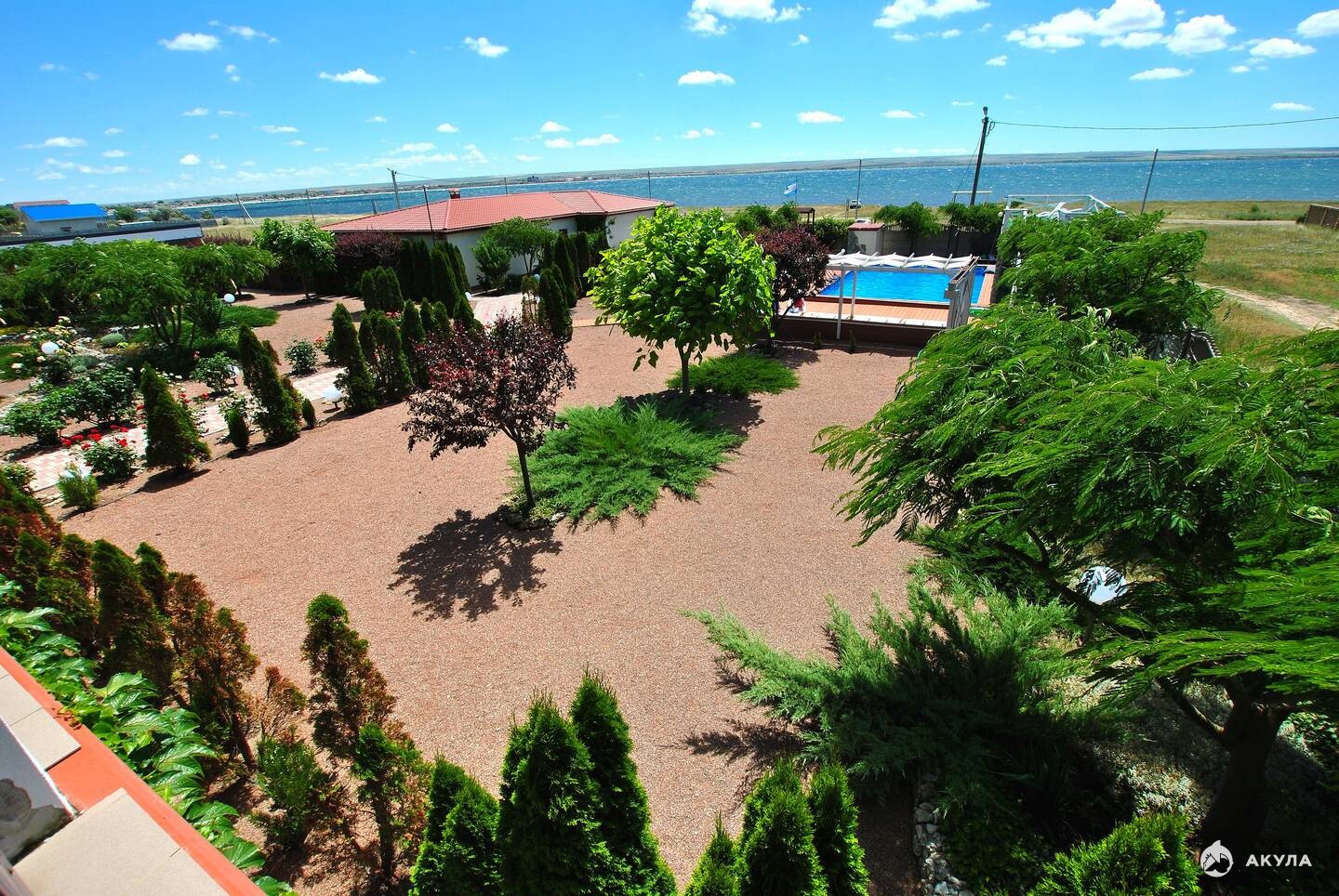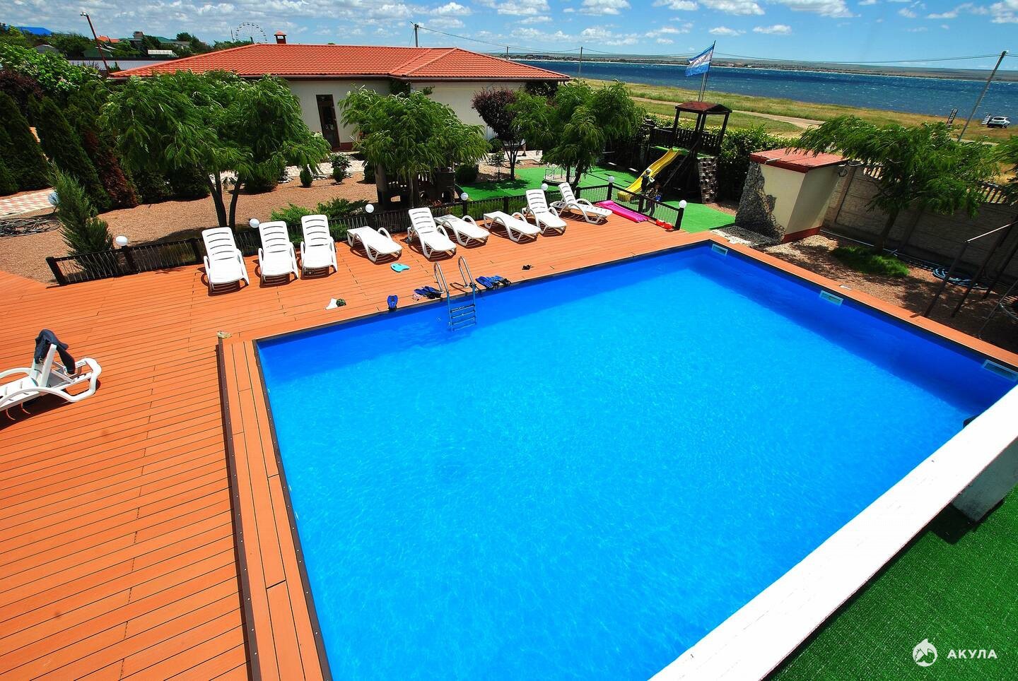 Большая благоустроенная территория имеет много зелени и цветов на которой расположены летняя площадка 120 м , просторный бассейн 80 м с морской водой, а также украшает небольшой декоративный пруд и фонтан.