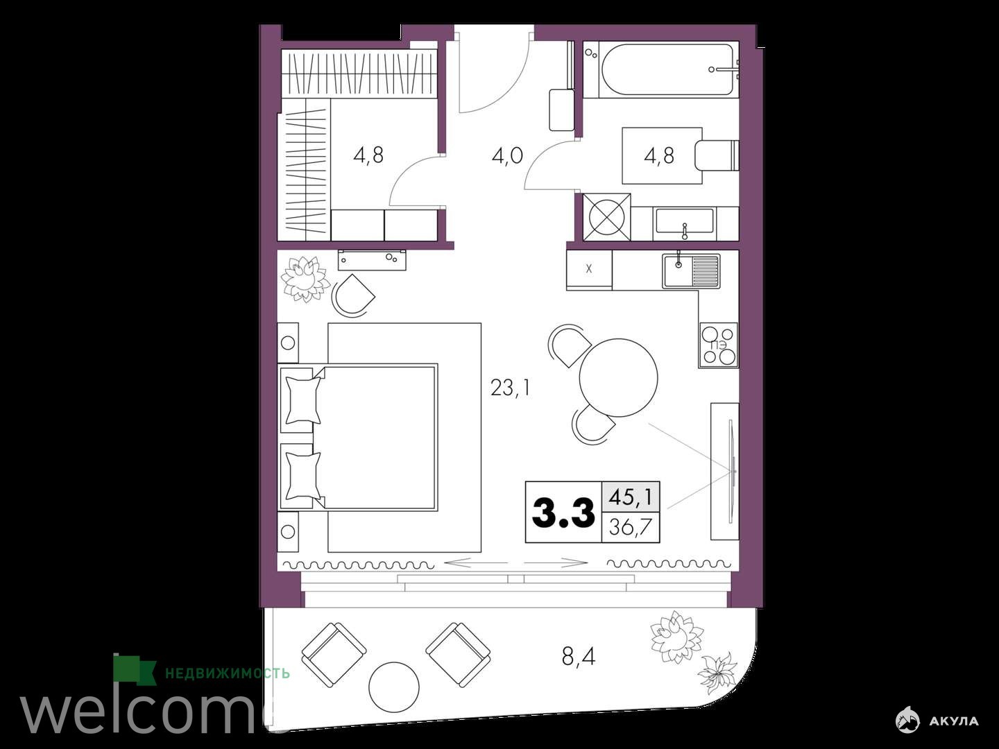 - 45 м²