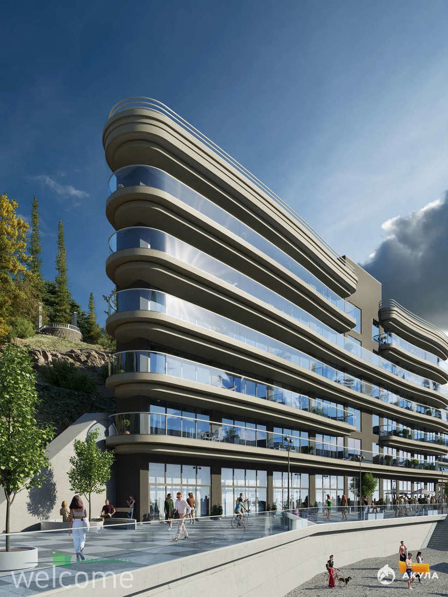- Архитектура, гармонирующая с природой: Шестиэтажное здание апарт-отеля органично вписано в окружающий пейзаж, создавая уединенное пространство для жильцов, не ограничивая их в доступе к городской жизни.