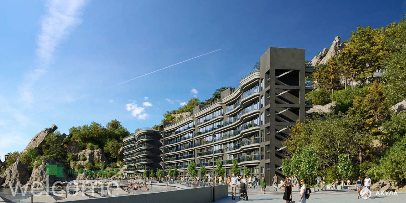 - Архитектура, гармонирующая с природой: Шестиэтажное здание апарт-отеля органично вписано в окружающий пейзаж, создавая уединенное пространство для жильцов, не ограничивая их в доступе к городской жизни.
